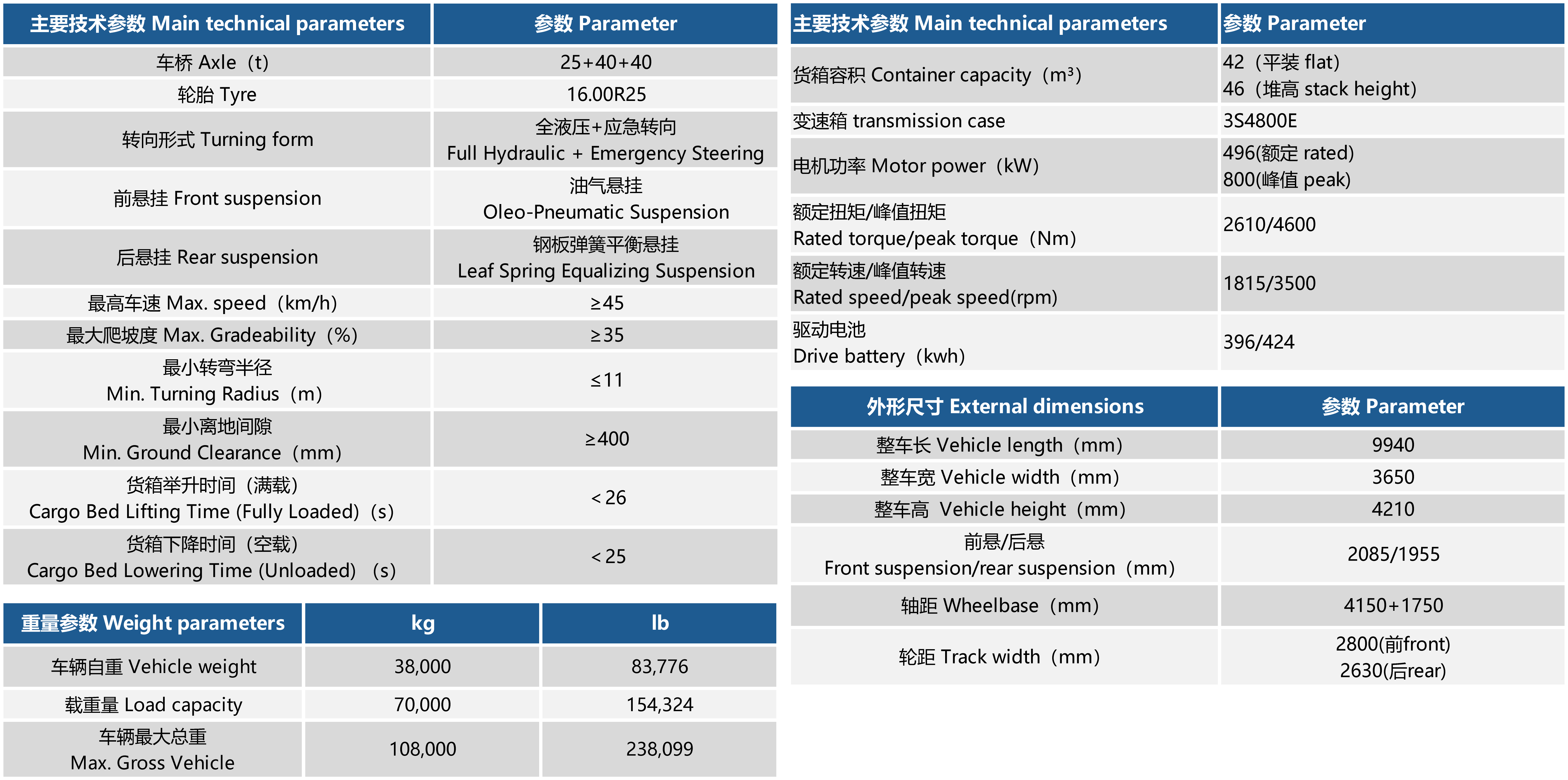 货箱平装42m³,内宽3.4m满足大型挖机装料需求;